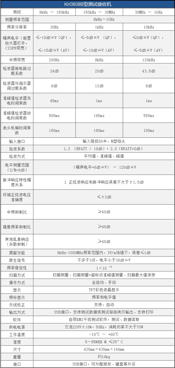 KH3938B接收机应用于电子电气设备的电磁兼容EMI干扰测试,包括传导骚扰及辐射骚扰测试,广泛应用于工厂EMI测试整改和实验室认证。