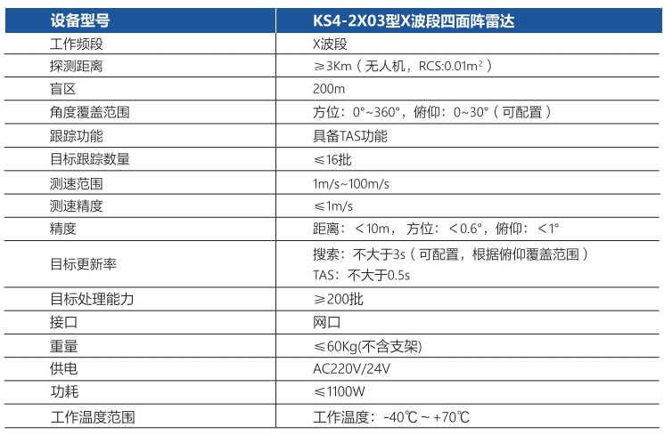 KS4-2X03型X波段四面阵雷达,由四个二维相控阵组成,采用全固态、全相参、脉冲多普勒体制,可全天候实现对“低小慢”目标的有效探测和预警。该雷达可实现360°全空域范围对目标的搜索和跟踪,并具备同时跟踪多个目标功能,较机扫雷达具有更高可靠性。