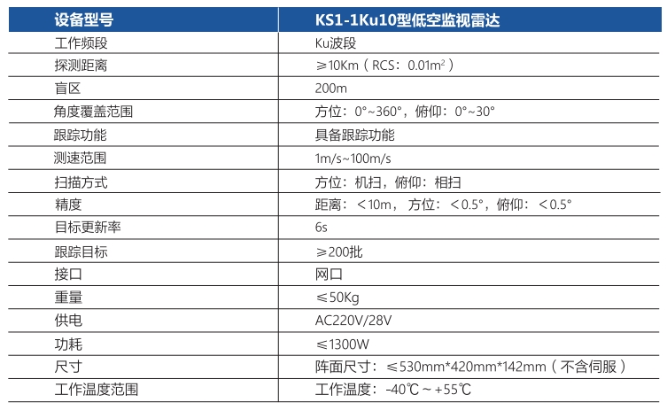 KS1-1Ku10型低空监视雷达为Ku波段相控阵雷达,采用全固态、全相参、脉冲多普勒体制,可全天候对快速机动的“低小慢“目标进行探测和跟踪。该雷达采用方位机扫、俯仰相扫方式,相对于二维相控阵和多波束雷达具有更高的性价比。