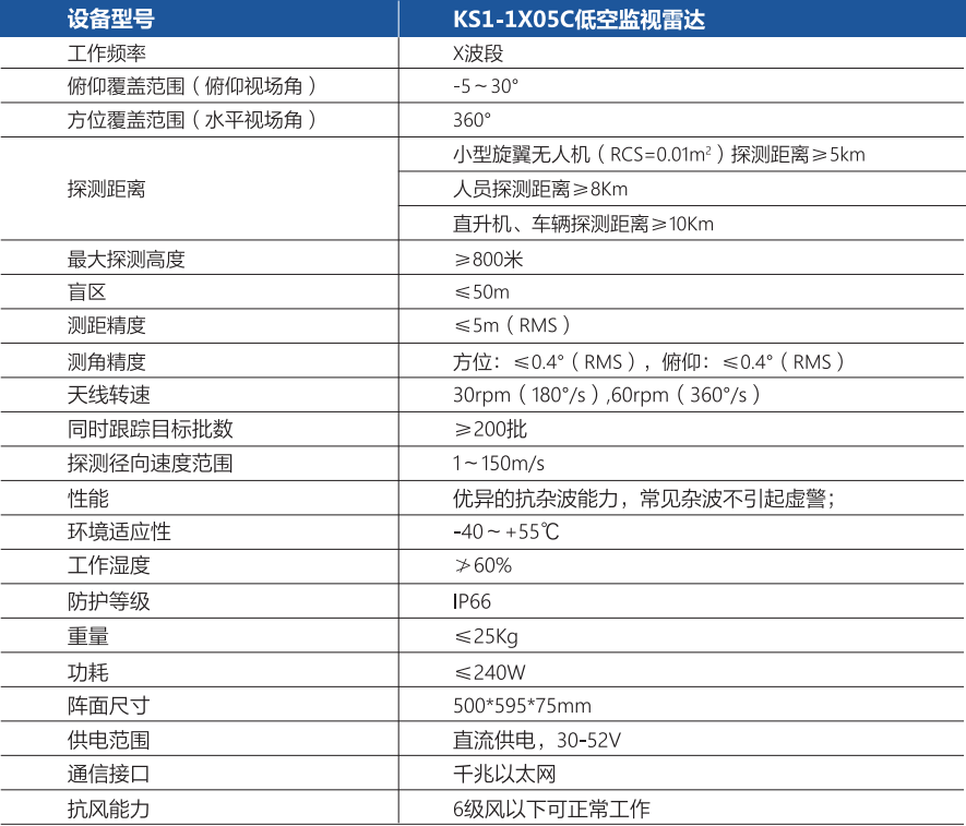KS1-1X05C型低空监视雷达采用主要应用于低空和地面监视,该雷达采用数字波束形成技术,等效全向辐射功率低,搜索数据率高。雷达采用自适应杂波抑制技术和密集目标检测前跟踪技术,杂波虚警率极低,可对超过200批目标进行自动跟踪建航,输出高精度位置信息。