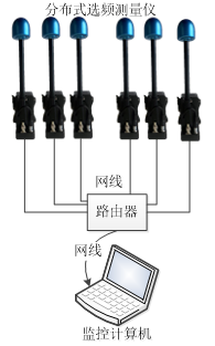分布式射频选频场强测试系统由多个OS-4D选频测量仪、路由器和监控计算机组成,其中选频探头三轴全向电场天线SRF-06,频谱分析模块,数据采集仪组成,如下图: