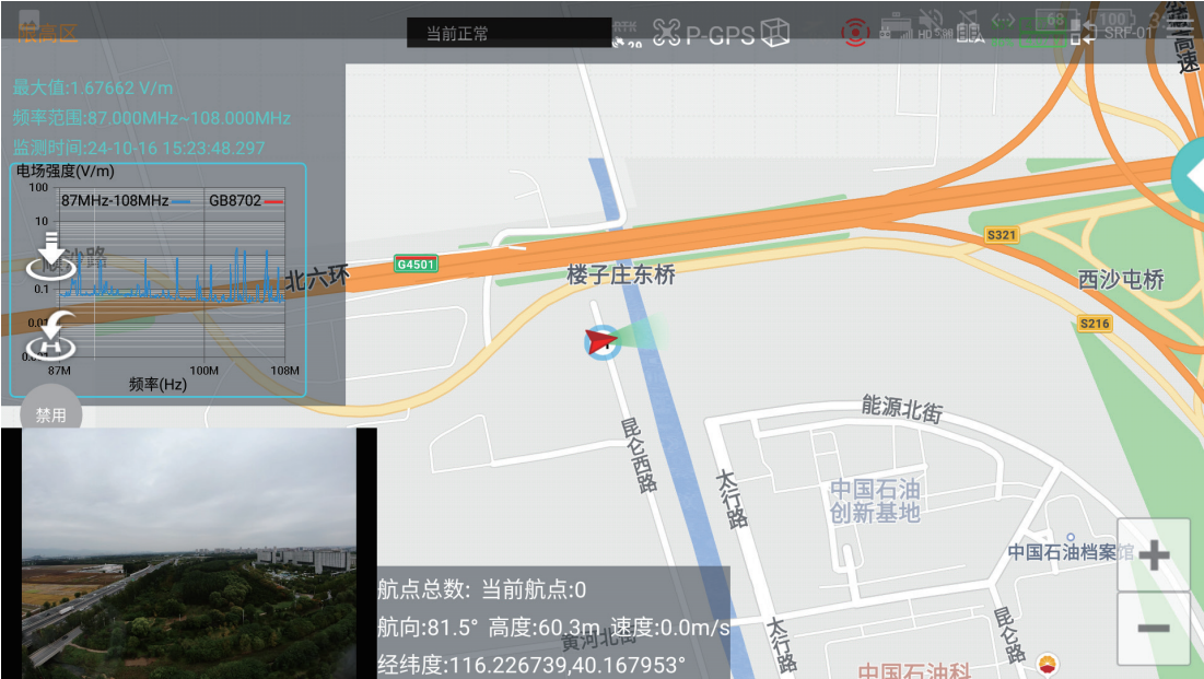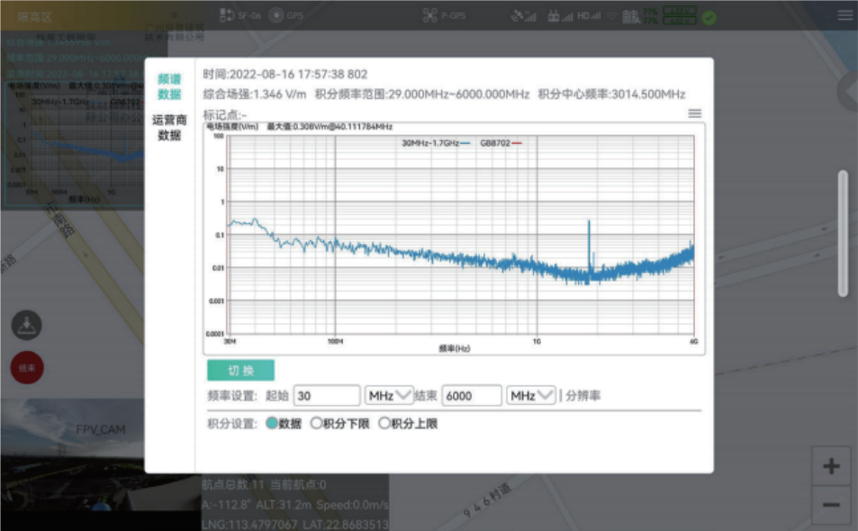天线性能无人机测试软件,用于飞行监测方案规划及飞行监测,其中飞行方案规划包括不限于水平方向图测试规划、垂直方向图测试规划、空间区域扫描测试规划等,支持设置飞行中心点、飞行半径、飞行仰角、飞行方位角,飞行速度,监测中心 频率及span, 飞行速度、航向、航点及轨迹、支持定点悬停监测和匀速飞行监测等。飞行测试时,基于地图显示无人机实时位置、状态及历史轨迹,实时及轨迹测试数据,频谱图,显示飞行任务概况和当前执行进度,以及机载摄像头的视频图像。