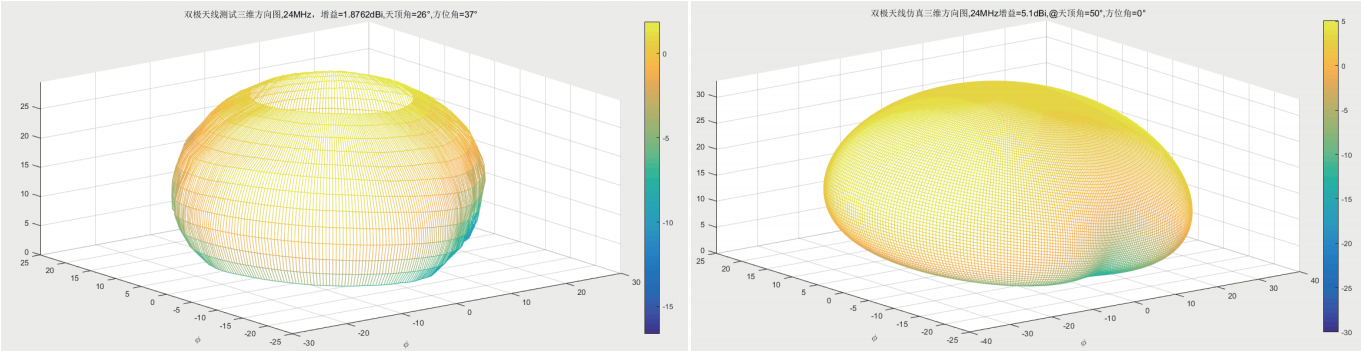 天线性能分析绘图软件基于无人机监测采集的数据、发射机的监测数据,计算被测天线的方向图,增益。支持水平放方向 图、垂直方向图及三维天线方向图的绘制。支持天线方向图仿真,支持对比实测天线方向图与仿真天线方向图。下图为双锥天 线的实测和仿真天线方向图。