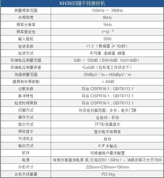 KH3933接收机应用于电子电气设备的电磁兼容EMI干扰测试,包括传导骚扰及辐射骚扰测试,广泛应用于工厂EMI测试整改和实验室认证。