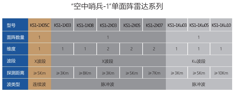 “空中哨兵”系列雷达有单面阵、四面阵两种不同规格,分别对应KS1、KS4两种系列型号;扫描方式有方位机扫+俯仰相扫和两维相控阵两种体制,对应雷达测量维度一维和二维扫描,相应的型号KS1-1和KS1-2、KS4-1和KS4-2;结合工作波段X波段、Ku波段和不同的探测距离,“空中哨兵”系列雷达的型号细分为KS1-1X03、KS1-1Ku03。