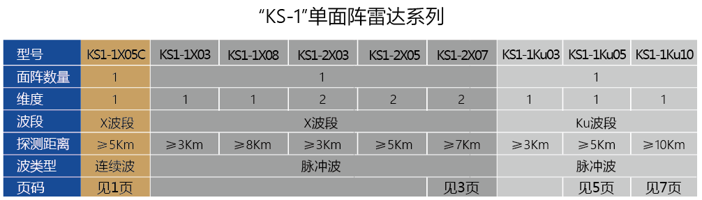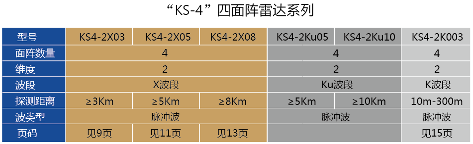 KS系列雷达有单面阵、四面阵两种不同规格,分别对应KS1、KS4两种系列型号;扫描方式有方位机扫+俯仰相扫和两维相控阵两种体制,对应雷达测量维度一维和二维扫描,相应的型号KS1-1和KS1-2、KS4-1和KS4-2;结合工作波段X波段、Ku波段和不同的探测距离,KS系列雷达的型号细分为KS1-1X03、KS1-1Ku03。