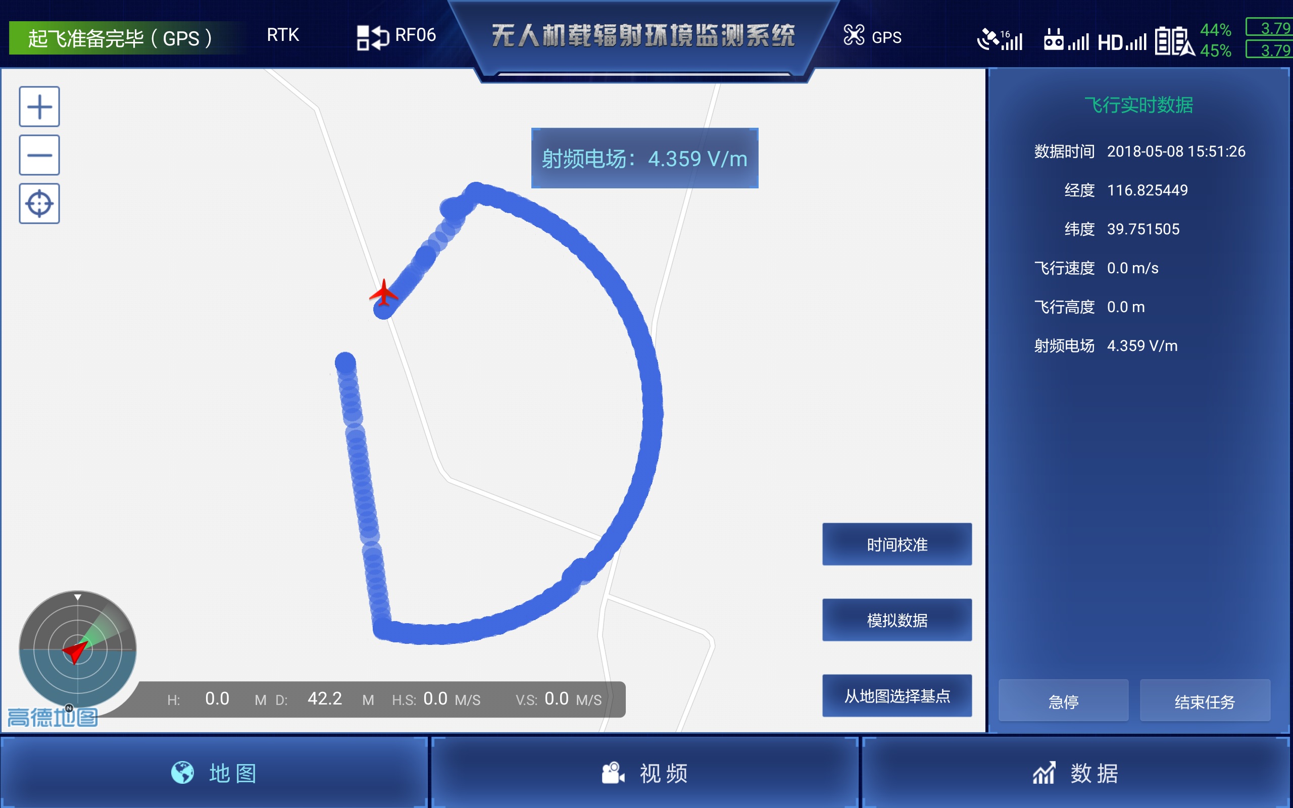 对于目标应用场景,OS-2平台软件中拥有“定点环绕监测”“垂直分布监测”“水平分布监测”等任务模式,可以对移动通信基站按照固定高度,固定半径进行360度环绕监测,也可按照固定间隔测量垂直高度上的电场分布,以及水平面上按照固定间隔的衰减情况。根据软件设置,无人机自动起飞,按照预设轨迹飞行每个监测点位悬停采集数据,实时传输到地面软件平台,并存储数据。