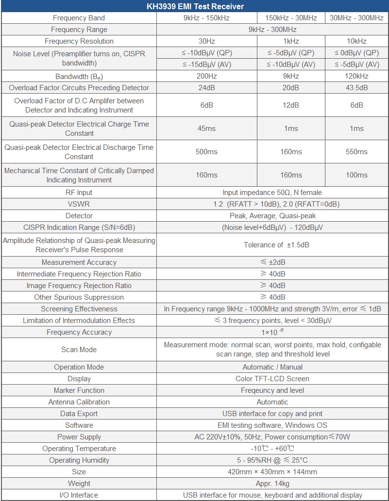 The KH3939 EMI Receiver is designed for EMI test of electrical and electronic products, including conducted disturbance and radiation disturbance tests, and has been well used in production EMI test and improvement.