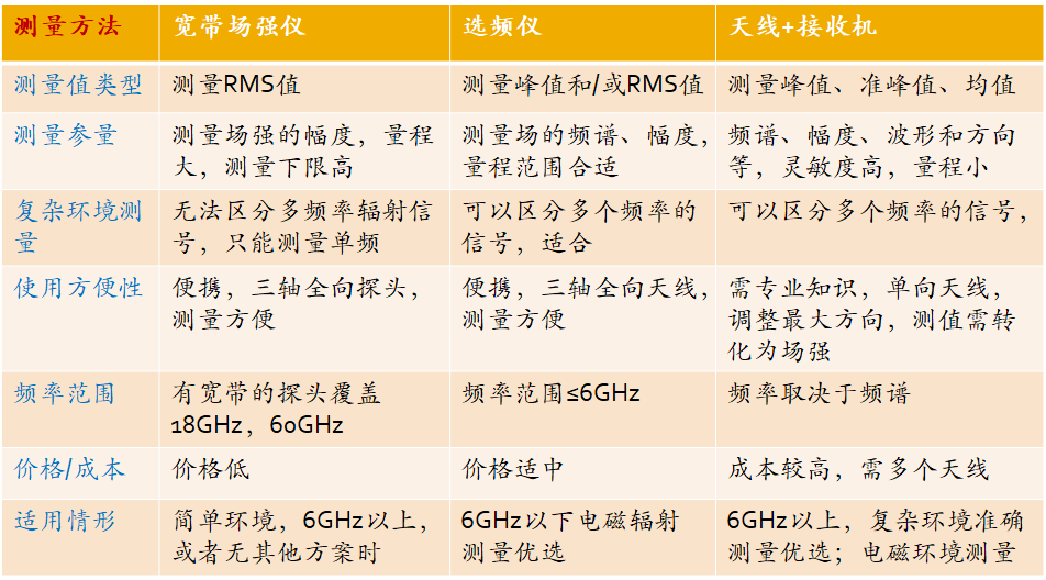 雷达的测量有三种方法:一是使用天线和频谱仪或者接收机进行测量;二是使用OS-4电磁选频分析仪进行测量;三是使用宽带场强仪SEM600和RF-06和或RF-18射频探头进行测量。各个方法测量的优缺点如下: