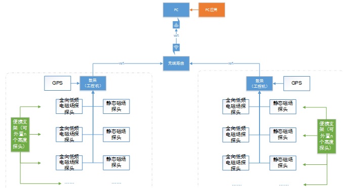 两个点位数采将数据和位置信息能够通过有线/wifi的方式上传到PC端进行显示、处理、分析、存储,并能够国内外标准的限值进行安全评估。
