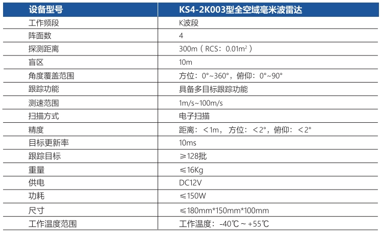 “独狼战术”通常在300米内针对一般雷达的近防盲区(通常为200米)和响应慢(通常约2秒)的弱点发起攻击,使用光纤控制机的高速穿越机(100m/s)单兵袭击或者集群袭击,有于在10米-300米的空域范围内,空间飞行距离短,高速穿越机(100m/s)速度快大约2~3秒即可逼近目标发起有效攻击,加之集群式攻击数量多,成为了近*的一种有效攻击方式,为了有效解决这样的情况,KS4-2K003型全空域毫米波雷达提供了0°~360°全空域覆盖、10米短盲区、10ms实时响应的毫米波雷达,有效应用于10米-300米全空域防护。