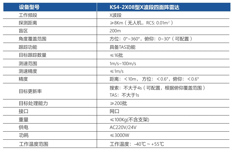 KS4-2X08型X波段四面阵雷达,由四个二维相控阵组成,采用全固态、全相参、脉冲多普勒体制,可全天候实现对“低小慢"目标的有效探测和预警。该雷达可实现360°全空域范围对目标的搜索和跟踪,并具备同时跟踪多个目标功能,较机扫雷达具有更高可靠性。